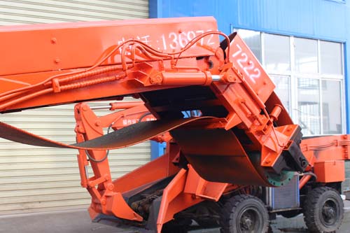 5、本機(jī)采用電動(dòng)全液壓傳動(dòng),液壓行走、挖掘采集、輸送、裝車(chē)四種功能,機(jī)構(gòu)緊湊,推進(jìn)力大,扒取范圍廣,可以全斷面裝巖,不留死角,不需人工輔助清理工作面
